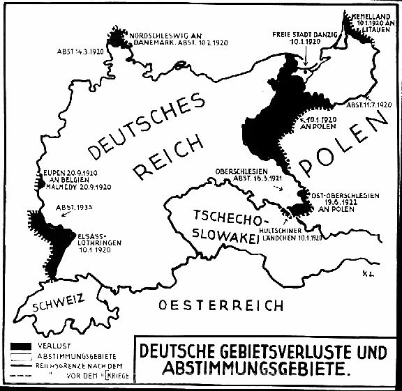 Demgegenüber nimmt sich das Dokument von Versailles13 vollkommen anders aus. Es enthält, wie Brest-Litowsk, weitreichende Bestimmungen über territoriale Abtretungen, und zwar neben Elsaß-Lothringen das Gebiet Eupen-Malmedy an Belgien, das nördliche Memelland an den Völkerbund (später von Litauen annektiert), große Teile der preußischen Provinzen Westpreußen und Posen an Polen, was den berüchtigten polnischen Korridor erzeugte. Danzig und Umland wurden zur freien Stadt. Für andere Gebiete wurden Abstimmungen vorgeschrieben, die später unter teils sehr fragwürdigen Bedingungen stattfanden.