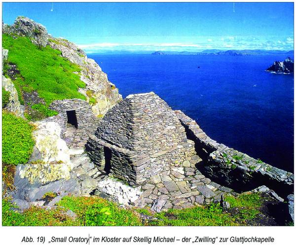 Die ohne viel Kontakt zu den Machthabern missionierenden Scoti schreckten davor freilich nicht zurück. Ihr Sendungsbewußtsein und ihr friedfertiges und offenes wie unerschrockenes Auftreten erreichte das einfache Landvolk auf Augenhöhe, nicht „hoch zu Roß“, und war wohl mit ein Grund ihrer Missionserfolge. Unter manchen anderen Stätten errichteten sie im Raum Irdning-Donnersbach ein heute verschollenes, doch in alten Dokumenten erwähntes kleines Kloster, zu dem die Expositur am Glattjoch errichtet wurde. Der Bau der Klause auf dem Glattjoch läßt sich aufgrund des geschichtlichen Zusammenhangs mit Virgil und der Karantanenmissionierung auf den Zeitraum von 700 bis 900 einschränken. Die Glattjochkapelle weist exakt die Baumuster und Proportionen der in dieser Ära in Irland errichteten Oratories auf und ist die einzige ihrer Art in Mitteleuropa. Das Buch „Irische Mission in Österreich und die steirische Glattjochkapelle“ beweist durch eine lückenlose Indizienkette, daß die Anlage auf der Jochhöhe im Frühmittelalter von irischen Mönchen und Klerikern geschaffen wurde. Aus den verschiedenen Wissensgebieten und Informationsquellen, die zum Teil mit dem Thema im engeren Sinn wenig gemein zu haben schienen, letztendlich aber doch die gesammelten Erkenntnisse abrundeten, formt sich dabei schließlich eine Gesamtübersicht: Die große Zahl von Teilinformationen läßt sich ohne ei- nen einzigen Widerspruch wie ein Puzzle zu einem in sich logischen Ganzen fügen. Bis zum Beweis des Gegenteils bildet die vorliegende Darstellung daher wohl die reale historische Wirklichkeit ab.