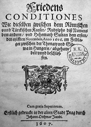Wenngleich der 1526 begonnene 1. Österreichische Türkenkrieg mit dem Frieden von Konstantinopel 1533 scheinbar beendet war, ging es in den folgenden Auseinandersetzungen (speziell 1541/42, 1550, 1568) erneut auch um die Herrschaft über Ungarn, und so wird die Zeitspanne von 1521 bis 1566 (Tod Suleimans I.) als zusammenhängender Konflikt gesehen. Der Krieg, der von 1566 bis 1568 stattfand, trägt u.a. die Bezeichnung 2. Österreichischer Türkenkrieg. In dieser Region herrschte seit 1555 ein permanenter Kleinkrieg, wiewohl die Habsburger stets Bestätigungen eines Vertrags von 1547 unterzeichneten, der Tributzahlungen an den Sultan festlegte. Doch da sich immer wieder von türkischer Seite „Akinci“ und von habsburgischer Seite „Uskoken“ zu Streifzügen in das Gebiet des jeweils anderen begaben, dehnten sich die Scharmützel zu einem offenen Krieg aus. Den Beginn desselben, des „Langen Türkenkriegs“ (1593–1606)[vi], bildete der habsburgische Sieg im Gefecht bei Sissek (22. Juni 1593). Nebenbei nutzte im innenpolitischen Konflikt zwischen Fürstentum und Ständen wie zwischen Katholiken und Protestanten der Türkenkrieg mit wachsender Dauer den Ständen und dem Protestantismus. Hierzu trug nicht unwesentlich auch der Bruderzwist im Hause Habsburg (die Brüder des Kaisers, allen voran Matthias, gegen das Reichsoberhaupt) bei.