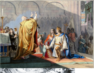 1325 erklärte sich Friedrich bereit, nach Österreich zu gehen, um seinen Bruder umzustimmen. Er gab sein Wort, wieder in die Gefangenschaft zurückkehren zu wollen, sollte ihm seine Mission mißlingen. Aber Leopold blieb starrsinnig, und Friedrich kehrte in die Burg Trausnitz zurück. Die Einlösung seines Versprechens berührte Ludwig IV. so sehr, daß er sich mit Friedrich aussöhnte und ihn zu seinem Mitregenten machte.1 Drei Jahre später, 1328, zog Ludwig nach Rom und ließ sich, da der Papst in Avignon residierte, von städtischen Beamten und einem Kardinal „im Namen des Volkes von Rom“ zum Kaiser krönen.