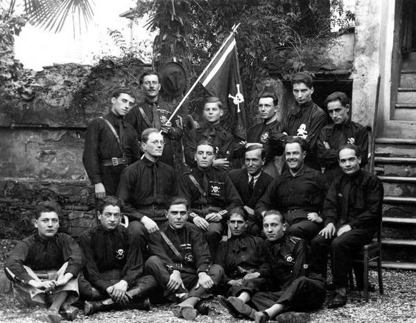 Stützen konnte sich die junge Bewegung auch auf die „Arditi“, mit denen der nationalistische und äußerst exzentrische Dichter Gabriele d’Annunzio im September 1919 in einem handstreichartigen Unternehmen die adriatische Hafenstadt Fiume für Italien eingenommen hatte. Im Kriege waren die Arditi bei besonders gewagten Kommandounternehmen eingesetzt worden. „Ardito“ bedeutet stark, mutig, und steht für besondere sexuelle Kraft. Ihr Lied war die „Giovinezza“, die spätere Hymne des italienischen Faschismus. In ihren Schwarzhemden, wohl dem der Landarbeiter der Emilia entlehnt, mit den gekreuzten Knochen mit dem Totenkopf als Symbol der Macht über Leben und Tod, ihren Breeches-Hosen und der schwarzen Fez-Kappe mit Quaste und Flammenemblem boten sie einen für viele furchteinflößenden Anblick und waren im politischen Leben Italiens etwas völlig Neuartiges. Instinktiv wußte Mussolini, daß diese Heimkehrer die Revolutionäre von morgen sein würden.