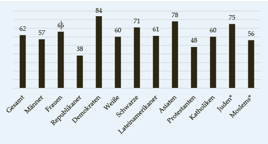 In der aktuellen, in Abb. 1 zitierten ISPU-Studie wie auch in einer älteren Untersuchung des Pew Research Center aus dem Jahr 2014 stellten die Juden jene religiöse Gruppe dar, die Abtreibung am stärksten befürwortet (2014: 83 %[7]). Vielleicht nicht so erwartet ist die Abtreibungsbejahung unter Moslems, ansonsten sind die religiöse Zugehörigkeit betreffend nur die Protestanten knapp ablehnend eingestellt. Schwarze und Asiaten in den USA sind abtreibungsfreundlicher als etwa Weiße; Frauen stärker als Männer. Demokraten geben sich überschwenglich, Republikaner deutlich negativ. Insgesamt ergibt sich eine klare Zustimmung zur Abtreibung.