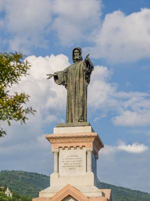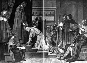 Arnold von Brescia war, wie wenig später Cola da Rienzo (1313–1354), ein Vertreter des Volks und römischen Bürgertums gegen die Macht der Kirche und des Adels. Arnold war in Brescia geboren, wanderte nach Frankreich, studierte unter Abälard Theologie und war jahrelang dessen Gefährte. Nach Brescia zurückgekehrt, stürzte er sich in den Kampf der Bürger gegen ihren Bischof Manfred. Arnold geißelte die Weltlichkeit der Priester. Arnold wurde aus Italien verbannt. Nach einem nicht eindeutig belegten Wanderleben trat Arnold als Demagoge in Rom auf. Offenbar unter seinem Einfluß forderten die Römer, daß der Kaiser seine Gewalt als einen Auftrag des römischen Senats und Volks betrachten solle. Friedrich Barbarossa sollte demnach das Volk und den Gemeinderat Roms als die Quelle seines Kaisertums anerkennen. Hadrian IV. trat nach seiner Wahl sofort der römischen Kommune entgegen und forderte die Ausweisung Arnolds. Die Verwundung eines Kardinals durch das Volk erklärte Hadrian zu einem Verbrechen an der Majestät der Kirche und legte das Interdikt direkt auf Rom. Kurze Zeit ertrugen die Römer das Interdikt, dann aber erhob sich das Volk und bat den Papst, ihm wieder die Segnungen der Kirche zu geben. Der Papst willigte ein, wenn Arnold sofort vertrieben würde. Arnold traf dann das Los aller Volkshelden. Das Volk, welches ihm lange zugejubelt hatte, gab ihn preis. Arnold entwich in die Toskana, wo er in die Hände des Kaisers fiel, der ihn dem Papst auslieferte. Dieser ließ ihn hinrichten.[v]