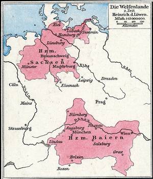 Heinrich, Herzog von Sachsen und Bayern, genannt der Löwe, aus dem in Norddeutschland noch heute (2022) begüterten Geschlecht der Welfen, war der Vetter des Kaisers. Wenn man an einen geheimen Sinn der Geschichte glaubt, findet man hier ein Vorstück zu 1914, als in Europa an der Spitze der mächtigsten Gegner zwei Vettern einander gegenüberstanden – König Georg V. von Großbritannien und Kaiser Wilhelm II. von Deutschland. Heinrich der Löwe war für mehr als zwei Jahrzehnte eine Stütze des Kaisers. Offenbar als Lohn erhielt Heinrich der Löwe 1156 das Herzogtum Bayern zurück, das seiner Familie von Kaiser Konrad entzogen worden war.