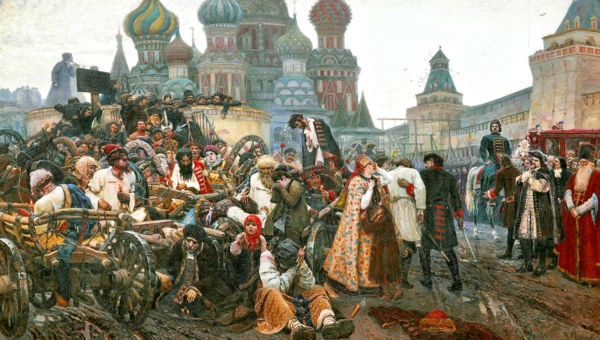 Zar Fjodor war jedoch keine lange Herrschaft beschieden. Er starb bereits im Jahre 1682. Angesichts Zarewitsch Iwans offenkundiger geistiger Schwäche wurde Peter von seiner Verwandtschaft aus dem Hause Naryschkin zum Zaren proklamiert, obwohl er jünger war als der übergangene Iwan. Die Verwandten von Zar Alexejs erster Frau (der Mutter des Zarewitsch Iwan) aus dem Geschlecht Miloslawskij waren damit nicht einverstanden. Sie zettelten eine blutige Revolte der Moskauer Strelizen-Truppen[i] gegen die Naryschkins an. Vor den Augen des zehnjährigen Zaren Peter wurden seine nächsten Verwandten und Erzieher von den aufgewiegelten Strelizen bestialisch ermordet. Diese Bluttat hinterließ tiefe Spuren in Herz und Seele des künftigen Kaisers und Selbstherrschers aller Reußen. Seitdem waren die Strelizen Peter ein Greuel.