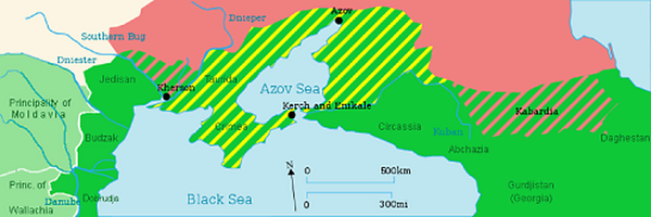 Nach dem 1774 abgeschlossenen Frieden von Kütschuk-Kajnardshi erhielt Rußland neben einer beachtlichen Kontribution große Schwarzmeergebiete (das sogenannte Neurußland), das Recht auf den Bau seiner Schwarzmeerfl?tte, freie Kertsch-, Bosporus- und Dardanellendurchfahrt sowie das Protektorat über die Donaufürstentümer Moldawien und Walachei. Das Khanat der Krimtataren, die mit türkischer Unterstützung jahrhundertelang Rußland und Polen-Litauen durch ihre Raubzüge heimsuchten, wurde von der Pforte in die Unabhängigkeit entlassen. Nach wiederholten Versuchen der Osmanen, die Krim mittels ihrer Strohmänner wieder unter türkische Kontrolle zu bringen, erklärte Kaiserin Katharina die Große am 8. April 1783 die Krim zum Bestandteil des Zarenreichs. Somit verlor die Pforte (die sich mit dem endgültigen Verlust der Krim erst 1784 offiziell abfand) ihren traditionellen Brückenkopf im Kampf gegen das Zarenreich.