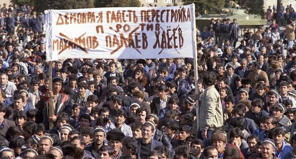 Der tadschikische Bürgerkrieg, der Schätzungen zufolge zwischen 20.000 und 150.000 Todesopfer forderte, hatte mehrere Ursachen: einerseits die sich verschlechternde wirtschaftliche Lage in der Endphase der Sowjetunion in den späten 1980er Jahren, andererseits die Entwicklung islami(sti)scher und demokratischer Bewegungen. War die Lage in Tadschikistan bereits kurz vor Zusammenbruch der Sowjetunion instabil – im Februar 1990 kam es in der Hauptstadt Duschanbe zu Unruhen –, brachte die Präsidentenwahl am 24. November 1991 das Faß zum Überlaufen. Der Kandidat der Kommunisten, Rahmon Nabijew, erhielt 57 Prozent und der aus Berg-Badachschan stammende und von der Islamischen Renaissance-Partei und der Demokratischen Partei unterstützte Oppositionskandidat Davlat Khudonazarov 35 Prozent der Stimmen. Die Opposition sprach von schweren Unregelmäßigkeiten bei der Wahl und erhob Manipulationsvorwürfe.