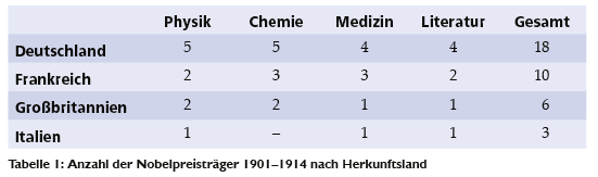 Vor 1914 gewannen fünf Deutsche den Chemie-Nobelpreis (Emil Fischer, Adolf von Baeyer, Eduard Buchner, Wilhelm Ostwald und Otto Wallach), weitere fünf Deutsche gewannen den Nobelpreis für Physik (Wilhelm Konrad Röntgen, Philipp Lenard, Ferdinand Braun, Wilhelm Wien und Max von Laue), weitere vier den Nobelpreis für Medizin (Emil von Behring, Robert Koch, der Entdecker der Erreger von Milzbrand, Tuberkulose und Cholera, Paul Ehrlich und Albrecht Kossel) sowie für Literatur Theodor Mommsen, Rudolf Eucken, Paul Heyse und Gerhart Hauptmann (Thomas Mann und Hermann Hesse erhielten erst nach dem Ersten Weltkrieg ihre Literatur-Nobelpreise, Nelly Sachs, Heinrich Böll, Günter Grass und Hertha Müller erst nach dem Zweiten Weltkrieg).
