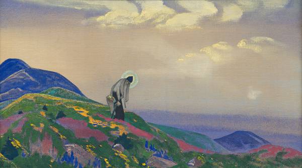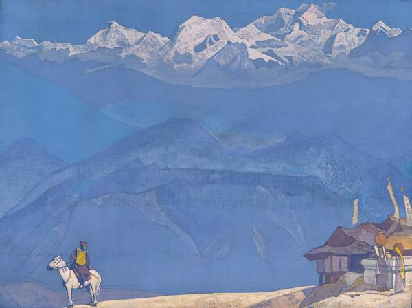 Bereits frühzeitig hatte sich Roerich in seinen Bildern mit Religiosität und Spiritualität beschäftigt. So widmete er sich beispielsweise im Rahmen seiner „Sancta“-Serie des Jahres 1922 der Askese in alten christlich-orthodoxen Klöstern. Roerich malte 1923 das Bild „Moses, der Anführer“, das den auf einem Berggipfel und unter einer bizarren Wolkenformation knienden Auserwählten Gottes zeigt. Er malte 1931 den heiligen Panteleimon auf einer bunten Heilkräuterwiese. Und zunehmend wandte er sich der Spiritualität der Himalaya-Region zu, deren Berge und Klöster er in ein magisches Spiel aus Licht und Dunkelheit tauchte. Nun erscheinen in seinen Bildern asiatische Gestalten vor einer beeindruckenden Gebirgskulisse: Ein tibetanischer Reiter in „Erinnern“ von 1924, ein vor seiner Höhle meditierender lamaistischer Mönch in „Die Botschaft des Adlers“ von 1927 oder Mongolen vor ihren in der weiten Steppe stehenden Jurten. Mehrere Bilder Roerichs beschäftigten sich auch mit dem tibetischen Nationalepos des Gesar Khan. Roerich zeigte sich dabei beeindruckt von der Interpretation des Mythos durch die Tibet-Forscherin Alexandra David-Néel: „Gessar Khan ist ein Held, dessen nächste Inkarnation in einem Ort im nördlichen Shambhala stattfinden wird, wo er seine Gefährten und Führer, die ihn während seines vergangenen Lebens begleiteten, vereinen wird. Sie werden wieder in Shambhala inkarnieren, von dem sie sich durch die geheimnisvolle Kraft ihres Anführers oder durch geheimnisvolle Stimmen, die nur die Eingeweihten hören, hingezogen fühlen werden.“