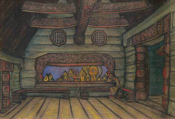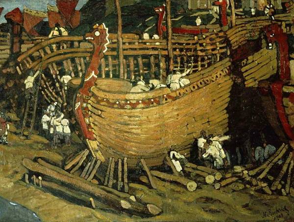 Anfänglich war Roerich stark von der slawischen Tradition beeinflusst. Unter anderem schuf er in dieser Phase christliche Fresken für die unweit Smolensk liegende Heilig-Geist-Kirche der Künstlerkolonie Talaschkino. Als Sujet wandte er sich häufig der slawischen Frühgeschichte zu. Man sieht bei ihm urtümliche Flechtwerksiedlungen mit Reetdächern und rudernde Alt-Slawen auf Einbäumen, zum Beispiel in dem 1897 gemalten Ölbild „Der Bote“. In „Der Stapellauf der Schiffe“ von 1915 erkennt man eine Gruppe Männer am Fuße einer Burg ein Schiff mit geschnitztem Tierkopf am Bug ins Wasser ziehend. Die Szenerie zeigt den kulturellen Einfluss der germanischen Waräger, die den Schiffbau in die von Slawen bewohnten Regionen brachten.
